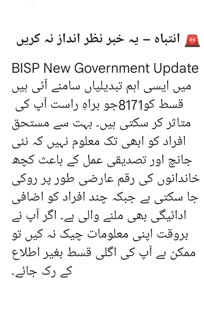 The BISP New Government Update provides important information regarding 8171 payments, biometric verification, and new government instructions for eligible families under the Benazir Income Support Programme.